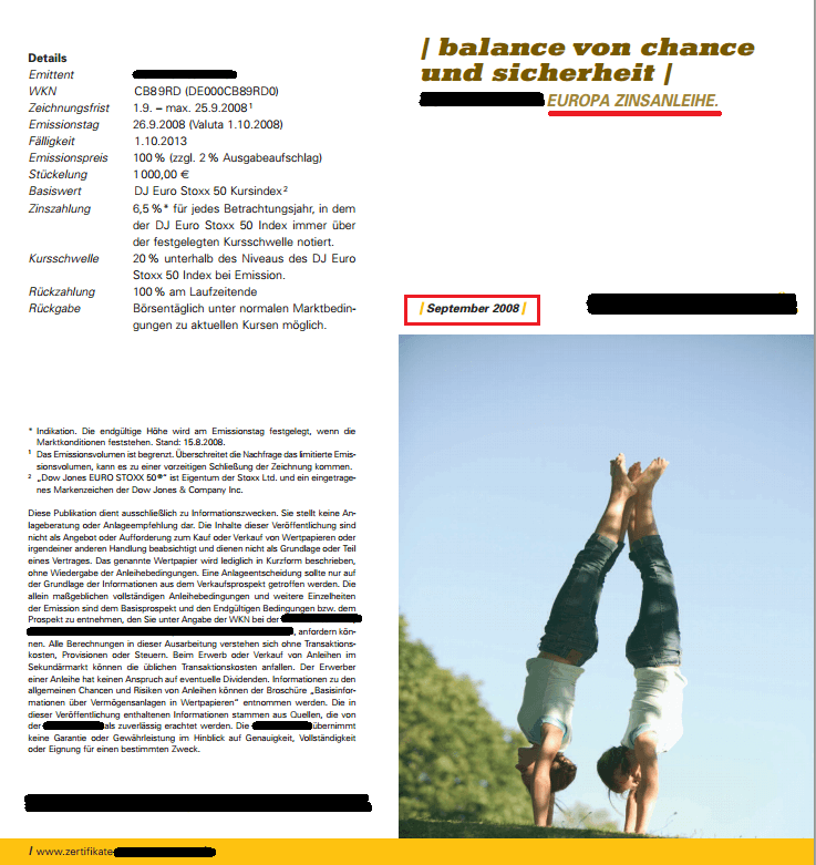 Diese Bank liefert - wie alle anderen auch - noch nicht einmal im September 2008, nach der Lehmanpleite einen Hinweis auf das Verlustrisiko für das eingesetzte Kapital. Ganz im Gegenteil, es wird dem Kunden sogar expressis verbis eine Kapitalgarantie am Laufzeitende vorgegaukelt, die es gar nicht gibt!