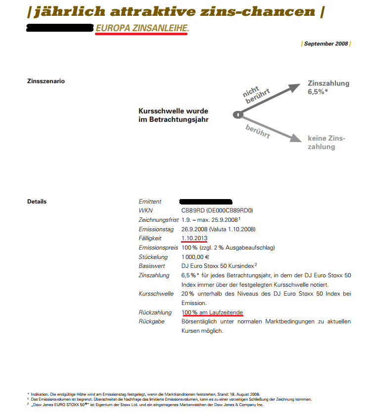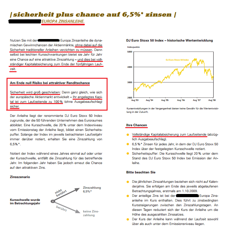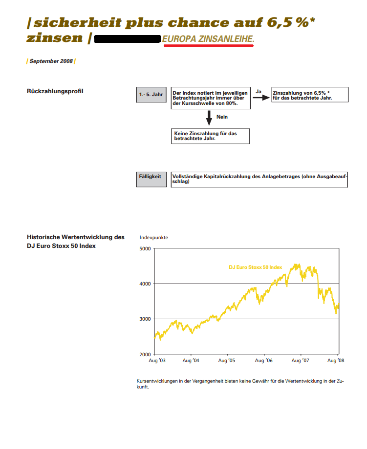 Die "Zinsanleihe" brachte dem düpierten Kunden statt der in Zeile 1 des Anschreibens in Aussicht gestellten "hohen Zinsen" tatsächlich in fünf Jahren nicht einen Cent "Zinsen", dafür aber hohes Risiko.