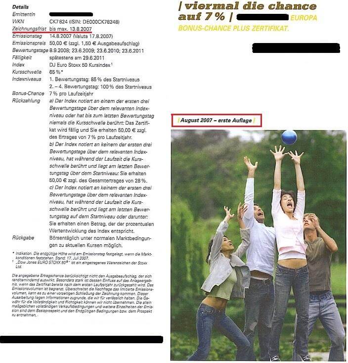 September 2006" enthält einen solchen Hinweis. Laut Zeugenaussage kann es nicht der hier gezeigte Produktflyer gewesen sein, denn angeblich kam ich mit dem Prospekt eines "7% Zertifikats