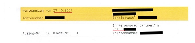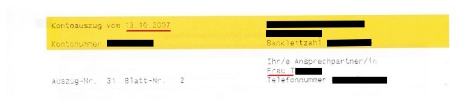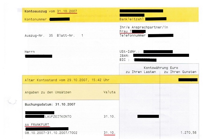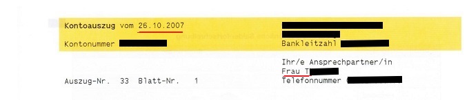 Man beachte die Verzinsung von 2% dieser Anlage angesichts der Behauptung, ich hätte keine drei Monate zuvor unbedingt ein Zertifikat haben wollen! Auf dem letzten Kontoauszug erkennt man die Neuanlage aus dem Verkauf am 26.10.2007 und den ersten Zahlungseingang vom Arbeitsamt für den ersten Monat der Arbeitslosigkeit, kurz nachdem ich angeblich mein Glück mit einer Wette um 50.000 Euro versuchen wollte. Darauf wurde in der Beschreibung meiner persönlichen Situation ab Juni 2007 hingewiesen.