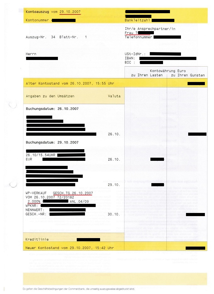 Das nächste Fehlverhalten wird auf den nächsten beiden Kontoauszügen sichtbar. Ich hatte eine von der Bank empfohlene Anlage am 26.10.2007 mit 5.204 Euro Verlust telefonisch zum Verkauf gestellt - bei der falschen Beraterin, weil diese Bank es nicht für nötig gehalten hatte, mich vom Wechsel in der Depotbetreuung am 01.10.2007 zu informieren. Die Verkaufsorder wurde von der seit 01.10.2007 nicht mehr zuständigen Beraterin B aufgenommen und ausgeführt, obwohl die neue zuständige Beraterin T im Hause war. Zu meiner großen Verwunderung wurde mir keine Neuanlage des Verkaufserlöses in ein anderes Finanzprodukt des Hauses angeboten. Ich wurde nur darauf hingewiesen, dass ich sofort über den freigewordenen Betrag verfügen könne, ein Verhalten, das mir völlig neu und unverständlich war, bis ich abends einen Anruf von einer, mir bis dahin völlig unbekannten, Dame auf meinem Anrufbeantworter hatte. Bei meinem Rückruf am nächsten Werktag erfuhr ich dann, dass diese Dame vier Wochen zuvor meine neue zuständige Beraterin geworden war. Bis dahin wusste ich weder von einem Wechsel in der Depotbetreuung, noch kannte ich den Namen meiner neuen Beraterin. (Auf meinem Kontoauszug achte ich nur auf den Kontostand rechts unten und die Kontobewegungen. Erst durch diesen Vorfall wurde ich auf die Nennung des zuständigen Beraters rechts oben aufmerksam.) Und genau aus diesem Grund der Vertuschung des nächsten hier zweifelsfrei dokumentierten Fehlverhaltens einem Kunden gegenüber musste in der Klageerwiderung hinsichtlich des Wechsels der zuständigen Beraterin gelogen werden. Dieser Wechsel fand nicht zum 01.11.2007 statt, wie dort wahrheitswidrig behauptet wird, sondern, wie hier ganz deutlich zu sehen ist, bereits zum 01.10.2007.
