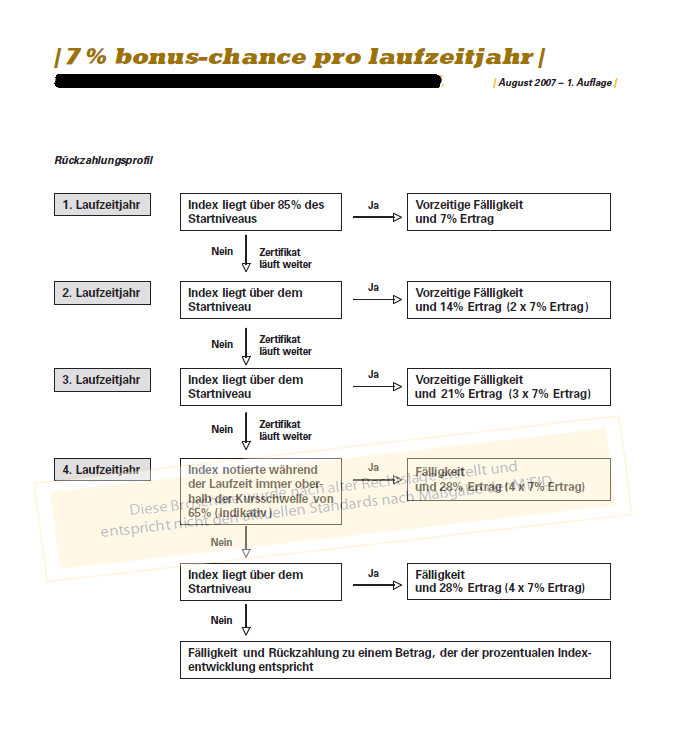 Wohlgemerkt: Ich habe weder den Produktprospekt noch das Rückzahlungsprofil vor, in oder nach der "Beratung" vom 03.08.2007 erhalten, mir selbst beschafft oder in der "Beratung" auch nur gesehen. Den Produktprospekt habe ich auf Verlangen in einem Gespräch mit dem Filialleiter am 14.10.2008 - 14 Monate (!) nach der "Beratung" - zur möglichen Rückabwicklung der Transaktion postalisch am 17.10.2008 erhalten. Die Bank hat eine Rückabwicklung der Transaktion (Erstattung meines eingesetzten Kapitals ohne Zinsen gegen Rücknahme der toxischen Papiere) abgelehnt.