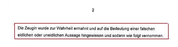 Nach den einleitenden Betrachtungen der Seite 1 wird in dieser und der nächsten Seite das Protokoll der Zeugenvernehmung analysiert und der Nachweis für zahlreiche falsche uneidliche Aussagen der Zeugin B erbracht.