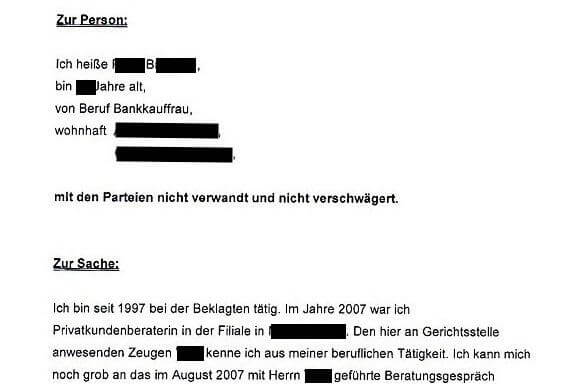 Dieser Satz ist der einzige, den ich in der gesamten Vernehmung dieser Zeugin glaube: Wenn man ein Beratungsprotokoll hat und als Zeuge vor Gericht zur Beratung vernommen wird, dann schaut man nicht mehr in dieses Beratungsprotokoll, um sich auf den Gerichtstermin vorzubereiten?
