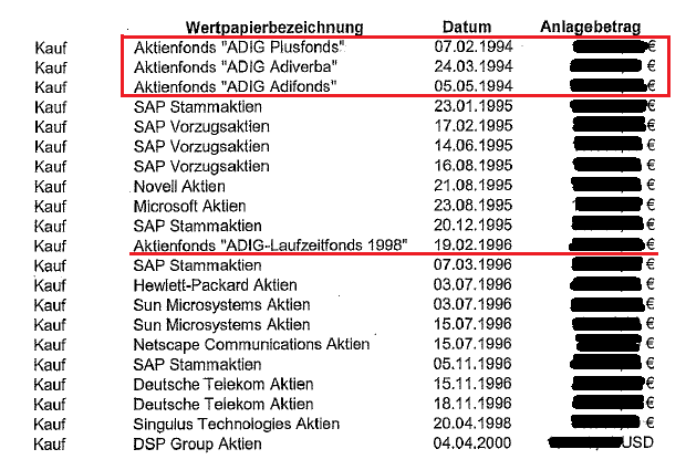 Von der Bank mit der Klageerwiderung präsentierte Aktienübersicht meines Depots von 1994 bis 2000