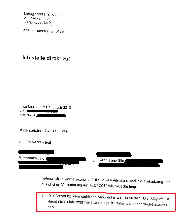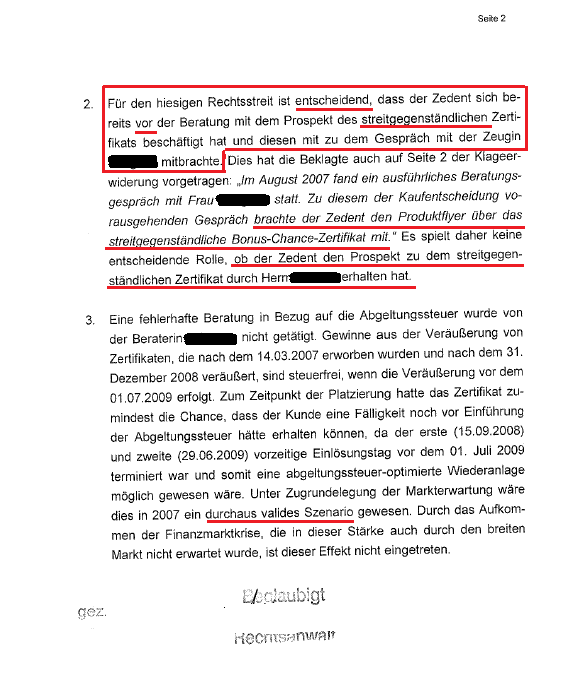 Mit der Aussage der Beraterin in der Vernehmung am 16.09.2010 wurde dieser Schriftsatz jedoch zum Eigentor. Als die Zeugin B der Bank die Version mit einem Flyer einer "anderen Tranche" bemühte, der angeblich dennoch das streitgegenständliche Zertifikat beschreibe, hat sie damit den Verfasser der Klageerwiderung der vorsätzlichen Falschaussage überführt und den vorliegenden Schriftsatz ad absurdum geführt: Einen Flyer einer "anderen Tranche" hätte ich ganz einfach auch vom "Zeugen" L in dessen frei erfundenen Beratung am 27.06.2007 erhalten haben können, und die Bank hätte sich Punkt 2 des vorliegenden Schriftsatzes schenken können.
