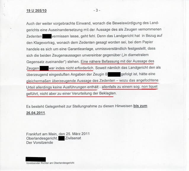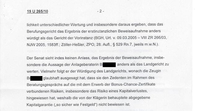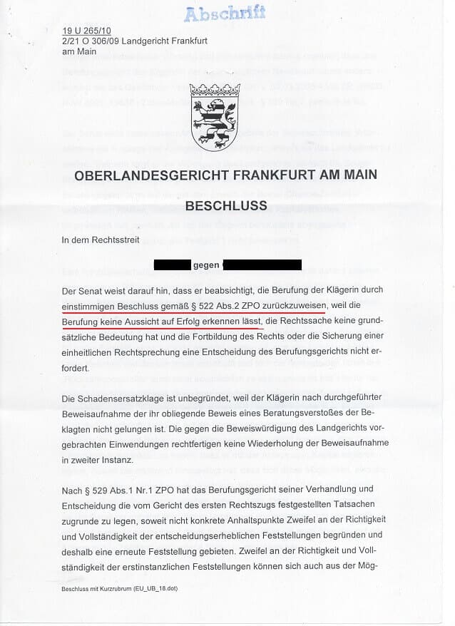 Zweifellos wussten auch die Frankfurter OLG Richter um die fehlende Hinweispflicht für das Verlustrisiko für das eingesetzte Kapital
