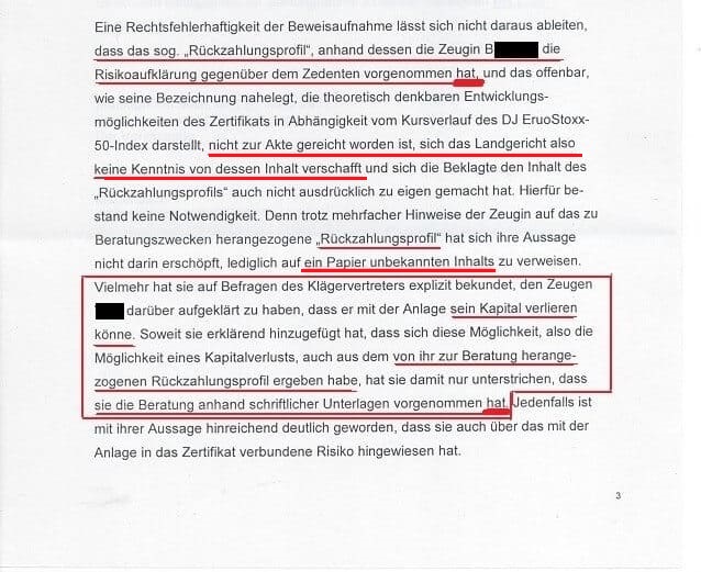 Soweit sie erklärend hinzugefügt hat, dass sich ... die Möglichkeit eines Kapitalverlusts auch aus dem von ihr zur Beratung herangezogenen Rückzahlungsprofil ergeben habe, hat sie damit nur unterstrichen, dass sie die Beratung anhand schriftlicher Unterlagen vorgenommen