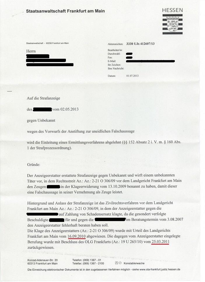 Hiermit widerlegt diese Staatsanwältin selbst ihre Ermittlungseinstellung vom 08.07.2011 zu einer Strafanzeige gegen die Zeugin der Bank. In jenem Schriftsatz kann sie nämlich nur mit einer klar erkennbaren vorsätzlichen Falschzitierung der tatsächlichen Zeugenaussage behaupten, sie lasse die Möglichkeit einer Beratung durch diesen Zeugen zu.