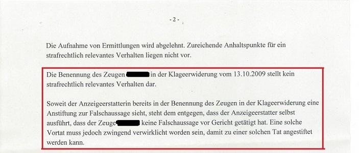 Ablehnung vom 01.07.2012 der Einleitung eines Ermittlungsverfahrens gegen den Anstifter eines falschen "Zeugen"