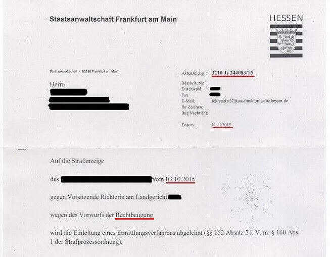 Eine solch absurde Gedankenkonstruktion habe ich selbst in diesem Skandalfall noch nicht gehört. Doch mehr hat die Staatsanwaltschaft Frankfurt am Main der Strafanzeige nicht entgegenzusetzen. Aber das reicht in unserem angeblichen Rechtsstaat für eine weitere Strafvereitelung im Amt zugunsten einer Richterin, die ihr Amt zur Beugung des Rechts missbraucht und so der Autorität der Justiz schwersten Schaden zufügt.