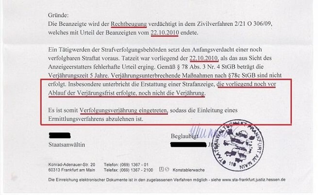 Die Staatsanwaltschaft Frankfurt am Main begründet ihre Behauptung damit, dass eine vor Ablauf der Verjährungsfrist erstattete Strafanzeige nicht als verjährungsunterbrechende Maßnahme in § 78c StGB genannt wird. Mit dieser "Begründung" würde jede fristgerechte Anzeigenerstattung notwendig zur Verfolgungsverjährung führen, weil nach § 78c StGB keine Anzeigenerstattung die Verjährung unterbricht, ganz gleich, ob sie drei Tage oder drei Jahre vor Ablauf der Verjährungsfrist erfolgt. Daraus schließen zu wollen, dass jede Erstattung einer Strafanzeige zu einer Verfolgungsverjährung führt, ganz gleich, wann sie erfolgt, ist offensichtlich auf absurde Weise falsch und abwegig: