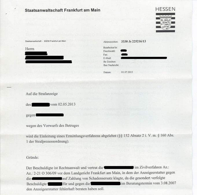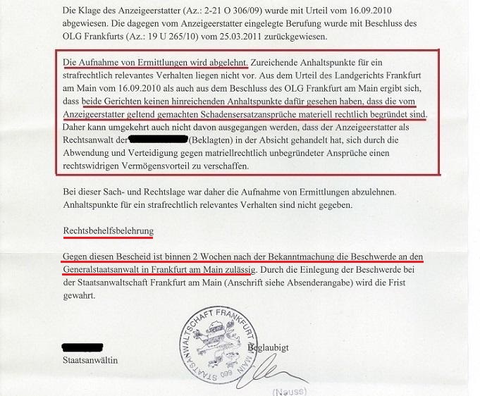 In dem vorliegenden Bescheid zu diesem Strafantrag wird mit einer Sachverhaltsverfälschung und dem üblichen unzulässigen, weil mit vorsätzlichen Fehlentscheidungen im Zivilverfahren "begründeten", Zirkelschluss mit den angeblich "materiellrechtlich unbegründeten Schadensersatzansprüchen" eine Ermittlung abgelehnt. Hierzu sei auf einen Strafantrag vom 08.08.2014 wegen Strafvereitelung im Amt gegen Frankfurter Staatsanwälte und auf meine Beschwerde gegen diese Ermittlungsablehnung verwiesen.