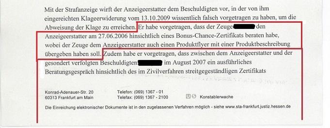 Mit dieser Behauptung bezieht sich die Staatsanwältin auf diese Beweisführung im Strafantrag gegen den Verfasser der Klageerwiderung. Meine Beweisführung bezieht sich leicht erkennbar nicht auf das unstrittige Beratungsgespräch durch die Beraterin, sondern auf den angeblich zu diesem Gespräch mitgebrachten Produktprospekt. Von diesem wird in der Klageerwiderung behauptet, es sei der zum streitgegenständlichen Zertifikat. Die Zeugin B behauptet in ihrer Vernehmung, es sei gerade nicht der zum streitgegenständlichen, sondern der zu einem "7% Zertifikat einer anderen Tranche". Nur die Zeugin B kann wissen, mit welchem Produktflyer ich angeblich in ihre Beratung kam. Der Verfasser wiederum kann seine Information nur von der Zeugin B der Bank haben. Das besagt der Einstellungsbescheid vom 08.07.2011, Punkt 2, zweiter Absatz derselben Staatsanwältin zur ersten Strafanzeige vom 07.05.2011 gegen die Zeugin B: