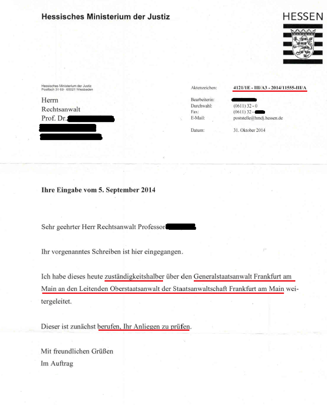 Nachricht vom 31.10.2014 des hessischen Ministeriums der Justiz zum Strafantrag vom 08.08.2014 mit Eingabe vom 05.09.2014