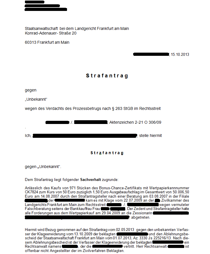 Strafantrag vom 15.10.2013 gegen den Informanten des Verfassers der Klageerwiderung