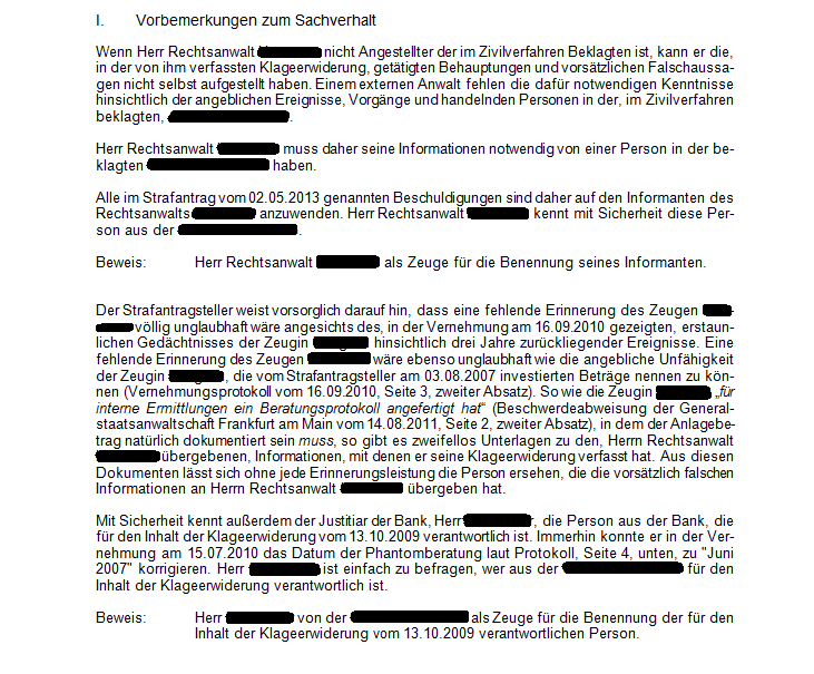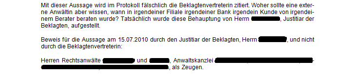 Der externe Anwalt als Verfasser der Klageerwiderung muss einen bankinternen Informanten gehabt haben, der ihm die nachgewiesenen Falschaussagen für seine Abfassung der Klageerwiderung geliefert hat.