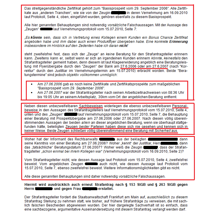 - Nachweis der vorsätzlichen Falschaussagen hinsichtlich der von der Bank frei erfundenenen Beratung mit Prospektübergabe durch einen frei erfundenenen "Zeugen"
