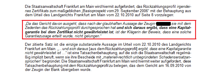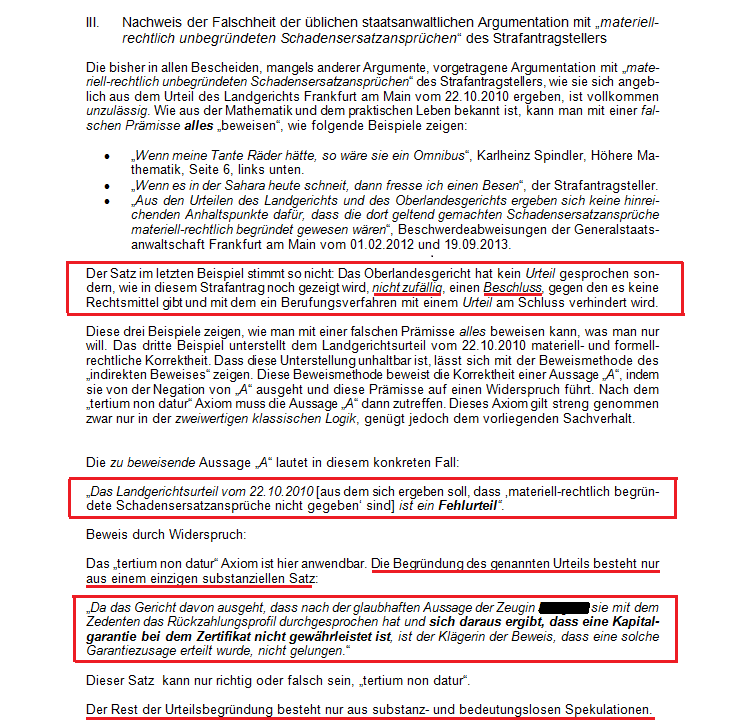 Nachfolgend lesen Sie meine überfällige Antwort auf die immer selbe Taktik der Staatsanwaltschaft, mit der sie mit einer falschen Prämisse alles beweist, was sie nur will: Aus dem Urteil im Zivilverfahren folge, dass meine Schadensersatzansprüche "materiellrechtlich unbegründet" seien, weshalb auch kein Prozessbetrug vorliegen könne. Mit diesem leicht durchschaubaren "Argument" - tatsächlich eine weitere Sachverhaltsverfälschung der Staatsanwaltschaft - werden, stets zu Unrecht, Ermittlungen gegen die des Prozessbetrugs beschuldigten Mitarbeiter der Bank abgelehnt. Diese Zirkulärargumentation ist völlig unzulässig. Die Staatsanwaltschaft muss, unabhängig von Gerichtsurteilen, von Amts wegen die in den Strafanzeigen vorgetragenen Sachverhalte aufklären. Das ist ihre Amtspflicht, aus der sie sich nicht mit Gerichtsentscheidungen herausreden kann. Dieses "Argument" ist erst recht ad absurdum geführt, wenn das Urteil als vorsätzliches Fehlurteil nachgewiesen ist.