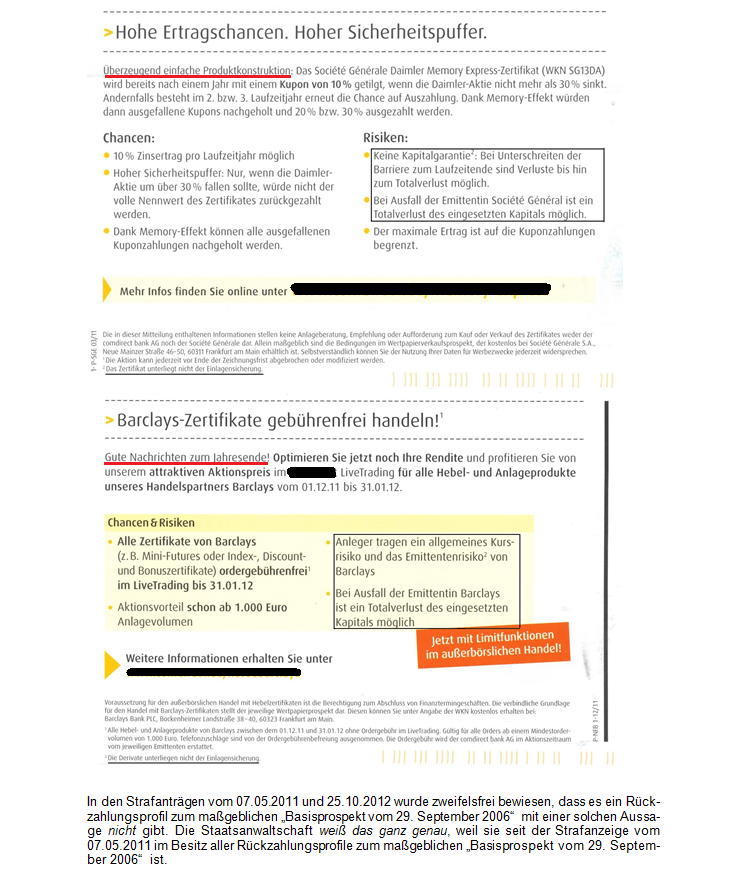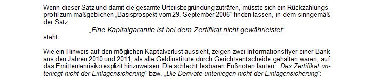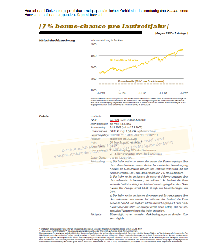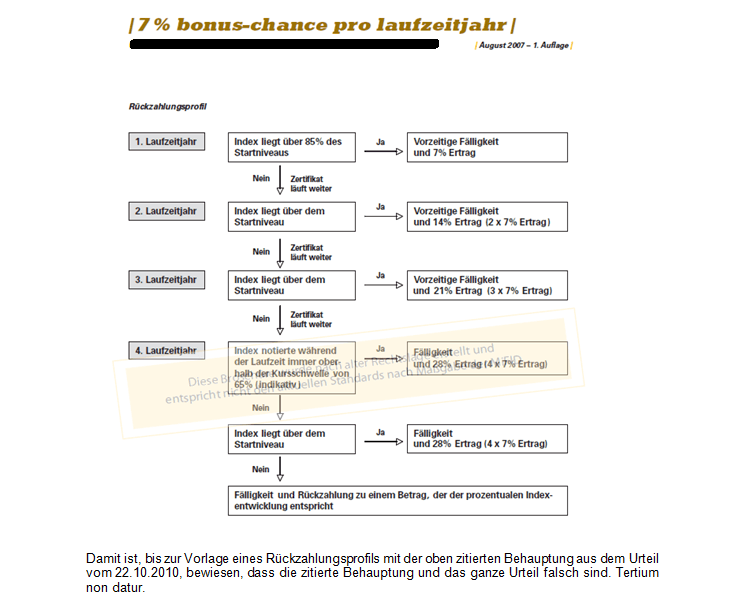 Wie dieselbe Bank selbst noch am 24.09.2008, mehr als ein Jahr nach der streitgegenständlichen Beratung das Verlustrisiko für das eingesetzte Kapital in einer schriftlichen Einladung für eine Beratung und in Produktprospekt und Rückzahlungsprofil des beworbenen Finanzprodukts vertuscht und expressis verbis dem Kunden eine Sicherheit seines eingesetzten Kapitals vorgaukelt, die es gar nicht gibt, sehen Sie in einem weiteren Beispiel eines als "Zinsanleihe" getarnten Zertifikats.