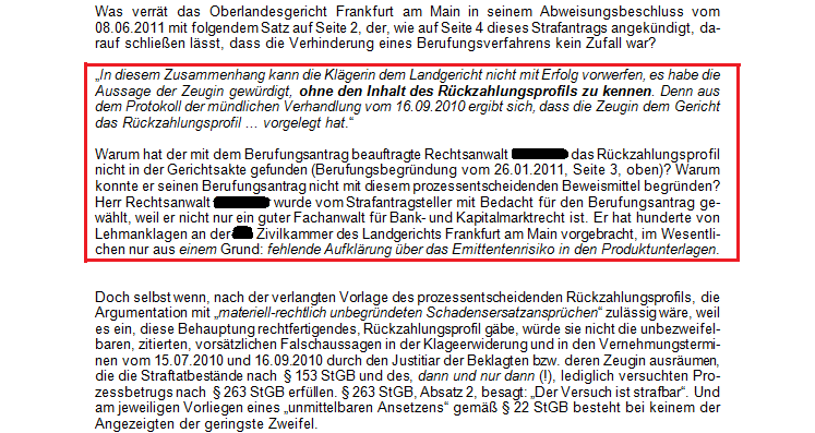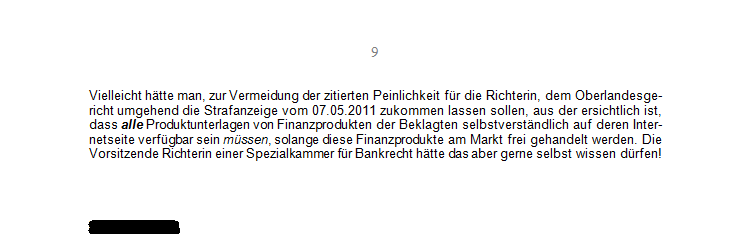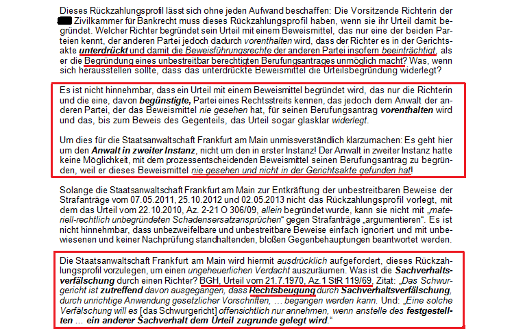 Und das Recht wird zudem ein zweites Mal gebeugt durch die Urkundenunterdrückung des prozessentscheidenden Beweismittels "Rückzahlungsprofil" in der Gerichtsakte mit der Absicht, die Begründung eines Berufungsantrags zu vereiteln, wie diese Anmerkung zur Anzeige der Urkundenunterdrückung in meinem Strafantrag vom 03.10.2015 gegen die Richterin zeigt.