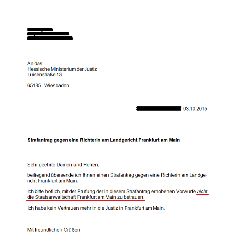 Strafantrag vom 03.10.2015 wegen Rechtsbeugung u.a. gegen eine Vorsitzende Richterin am Landgericht Frankfurt am Main