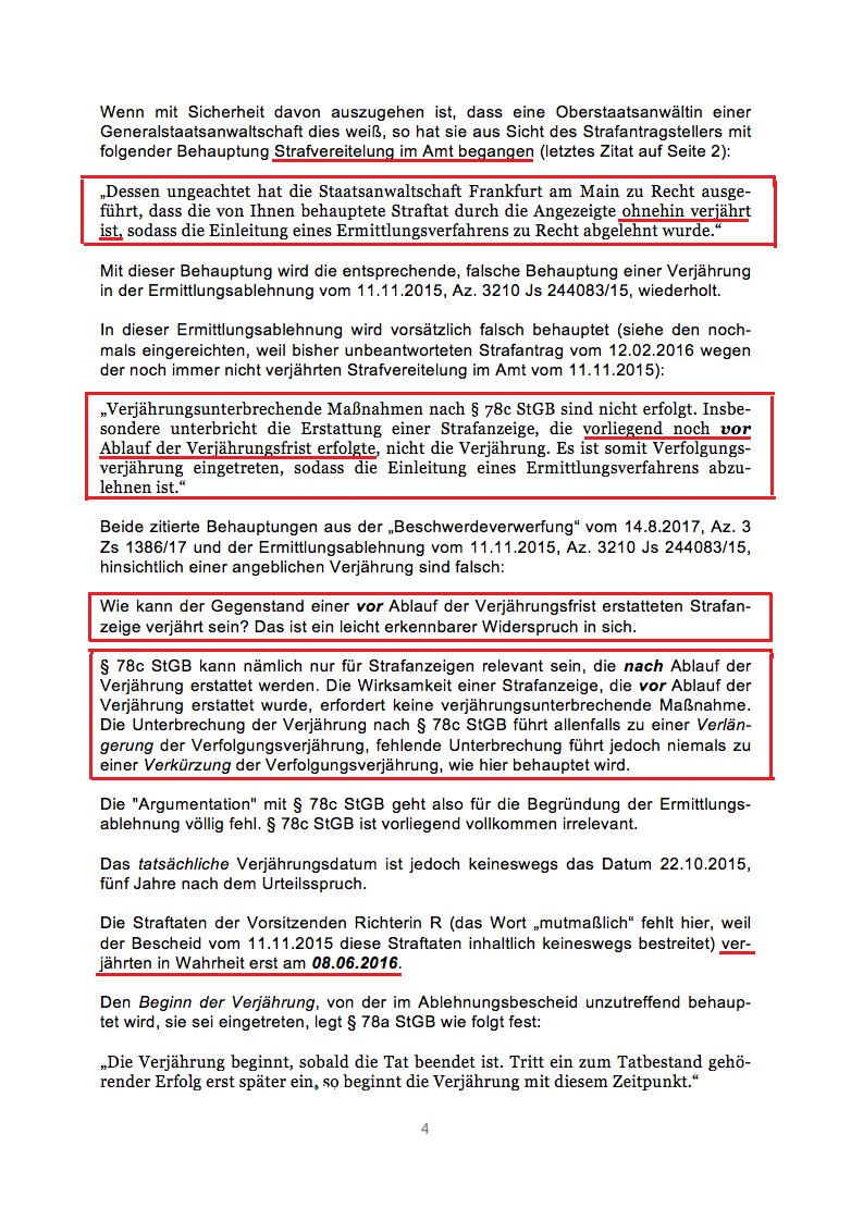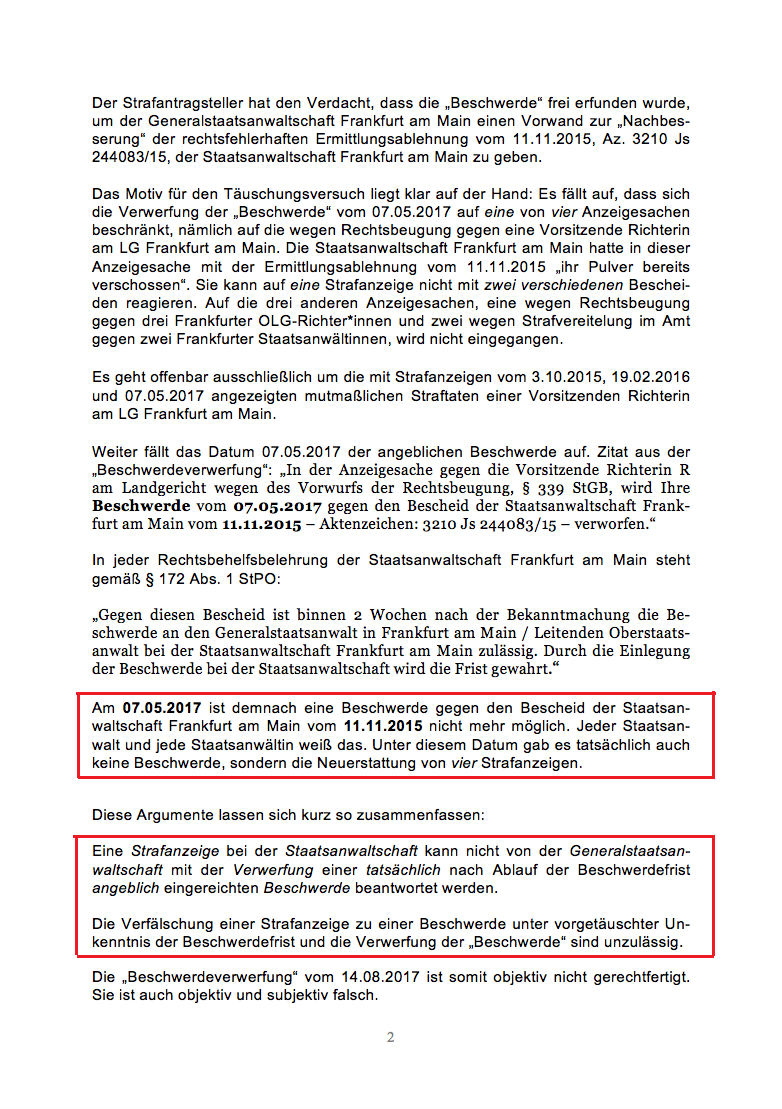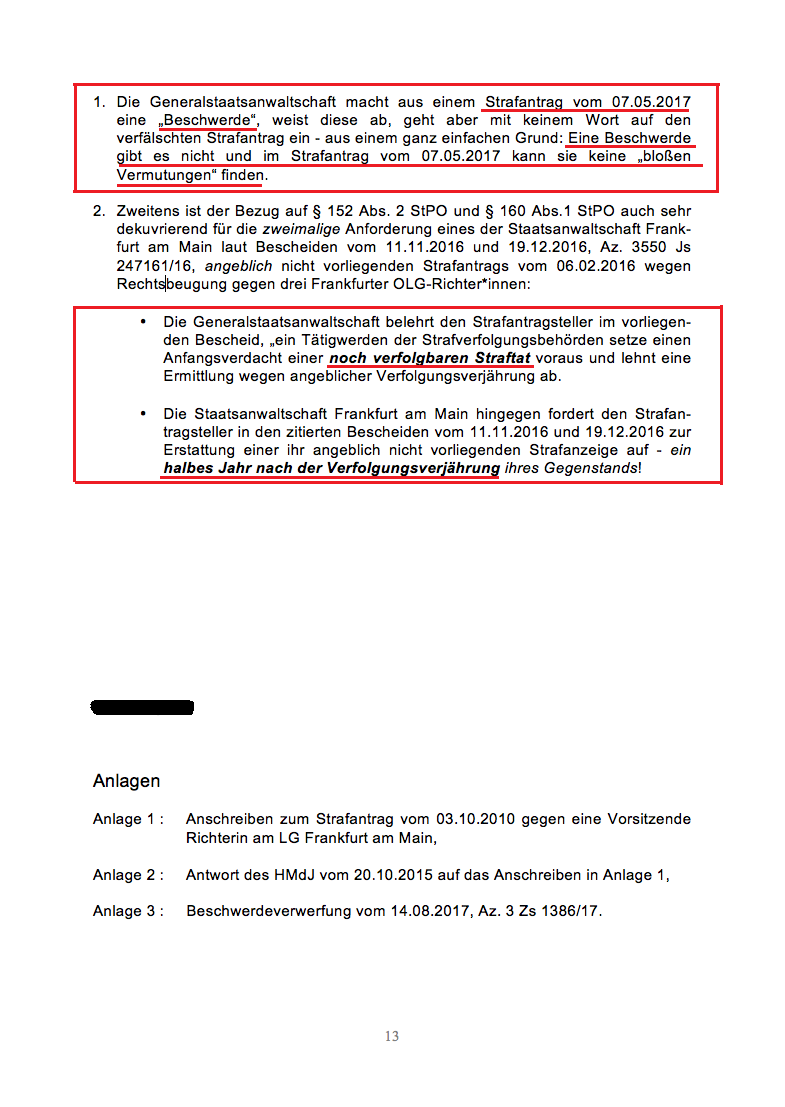 Gegenstand dieses Strafantrags ist die Verfälschung von vier am 07.05.2017 dem HMdJ zugestellten Strafanzeigen zu einer Beschwerde und deren Verwerfung vom 14.08.2017 durch die Generalstaatsanwaltschaft Frankfurt am Main.