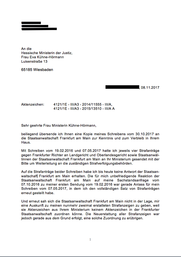 Anschreiben vom 08.11.2017 an die hessische Justizministerin zur dritten Erstattung vom 30.10.2017 meiner Strafanzeigen vom 19.02.2016