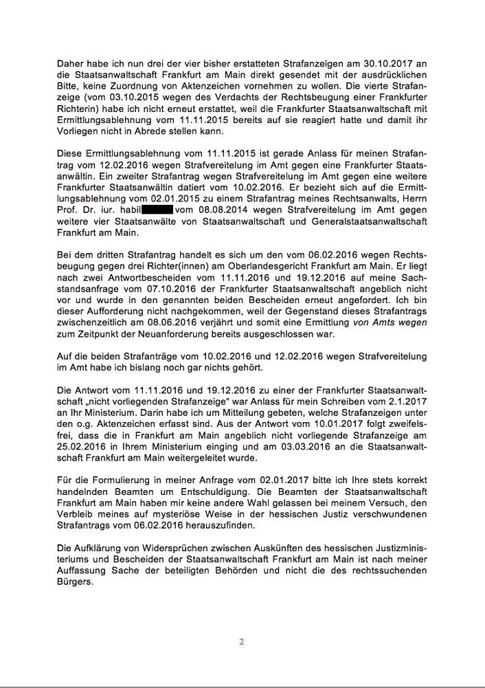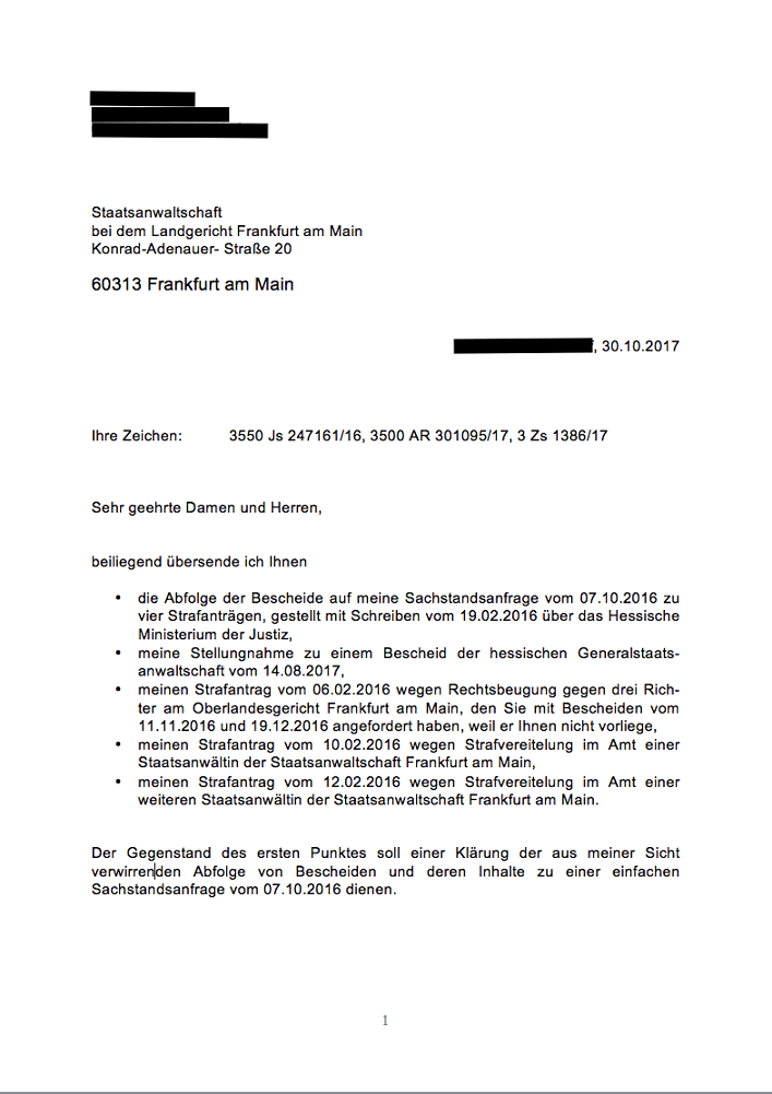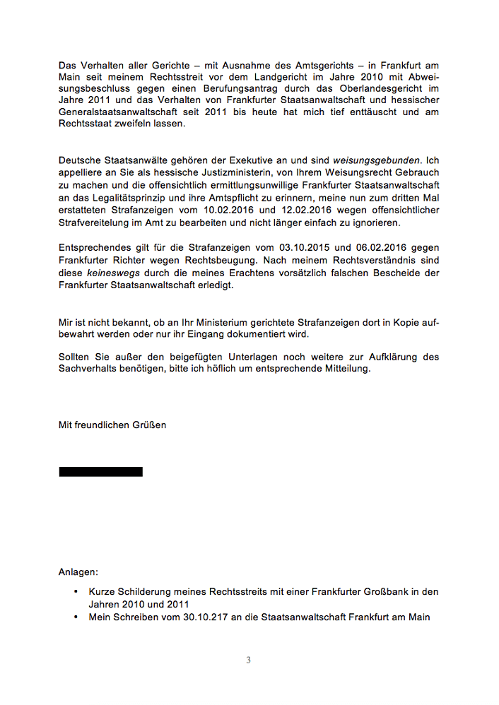 Dritte Erstattung meiner Strafanzeigen vom 19.02.2016 bei der Staatsanwaltschaft Frankfurt am Main am 30.10.2017 mit Kopie an die hessische Justizministerin