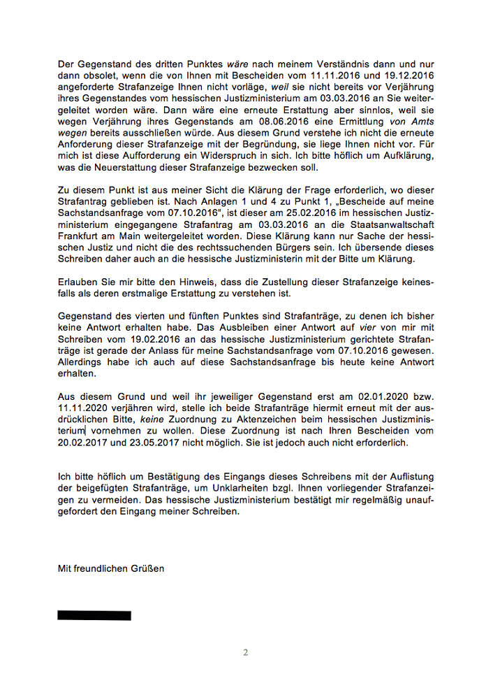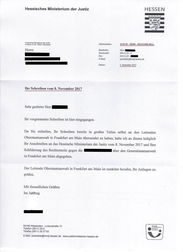 Im Gegensatz zum HMdJ hat die Staatsanwaltschaft Frankfurt am Main auf die nun ihr direkt zugestellten Strafanzeigen bislang nicht reagiert. Nach der ersten Erstattung vom 19.02.2016 lag ihr angeblich eine Strafanzeige nicht vor, die drei anderen wurden ignoriert. Nach der zweiten Erstattung vom 07.05.2017 konnte sie Aktenzeichen aus dem HMdJ keinem Aktenzeichen in ihrem eigenen Aktenbestand zuordnen. Nach dem Wegfall beider möglichen "Begründungen" kommt nun gar keine Antwort mehr.