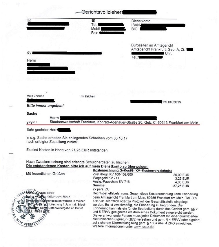 Am 19.06.2019 habe ich zwei Strafanträge wegen Strafvereitelung im Amt gegen die Staatsanwältinnen M und S vom 12.02.2016 bzw. 10.02.2016 zum vierten Mal, nun über den zuständigen Gerichtsvollzieher am Amtsgericht Frankfurt am Main, der dortigen Staatsanwaltschaft zustellen lassen. Die Zustellung erfolgte am 24.06.2019.