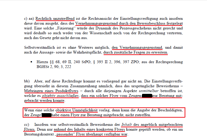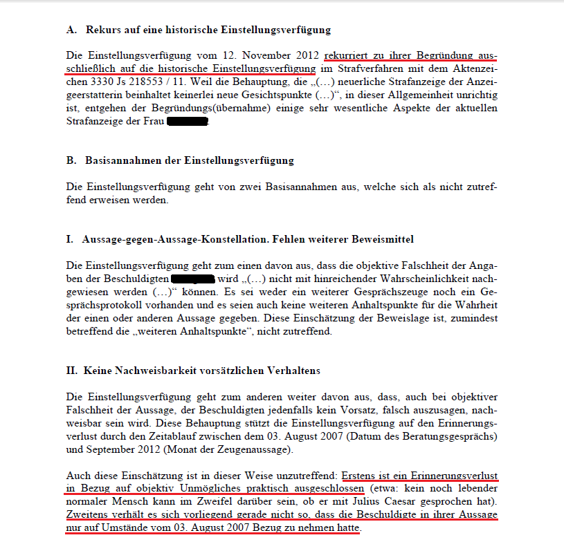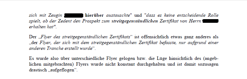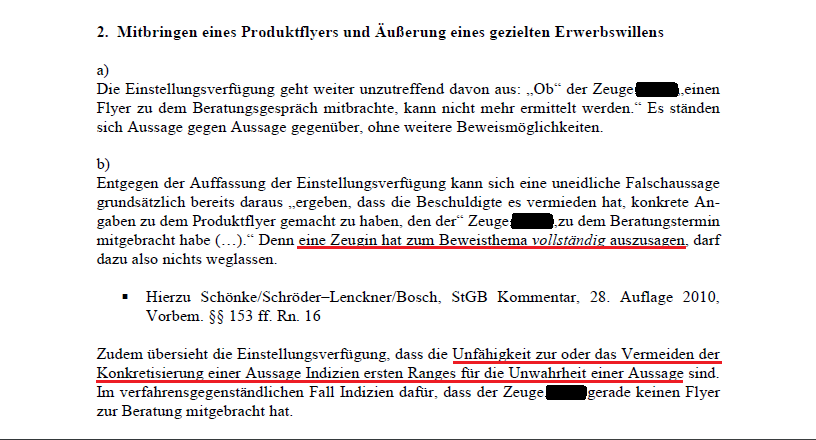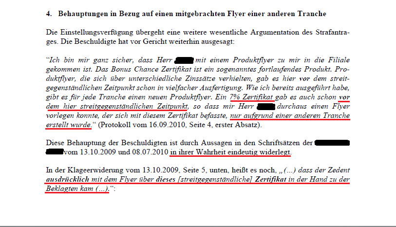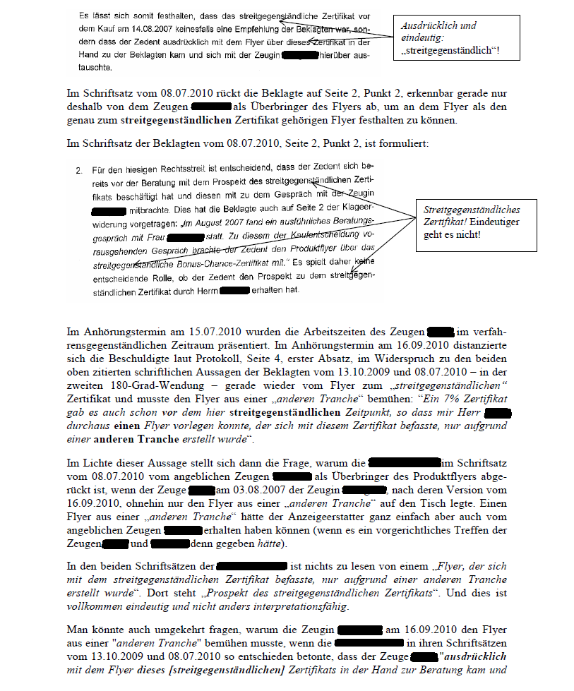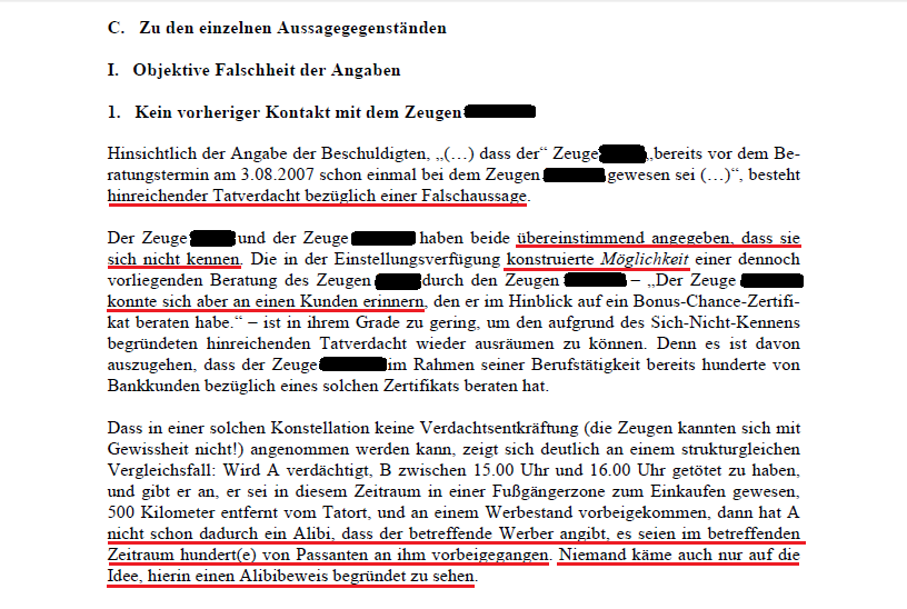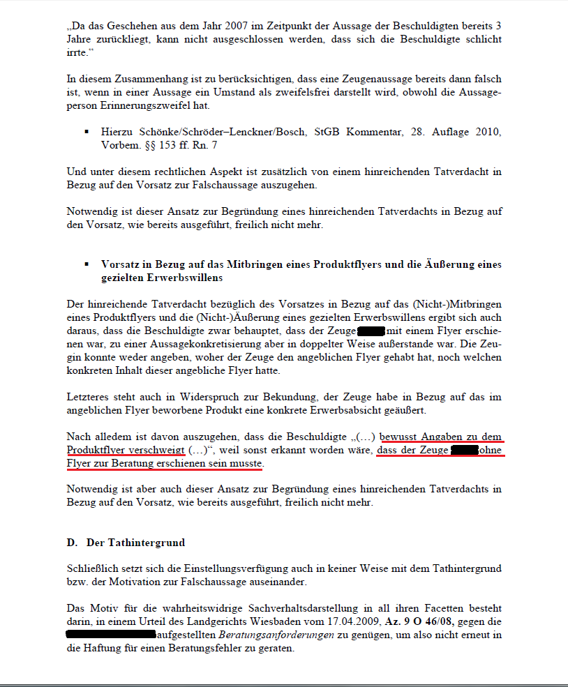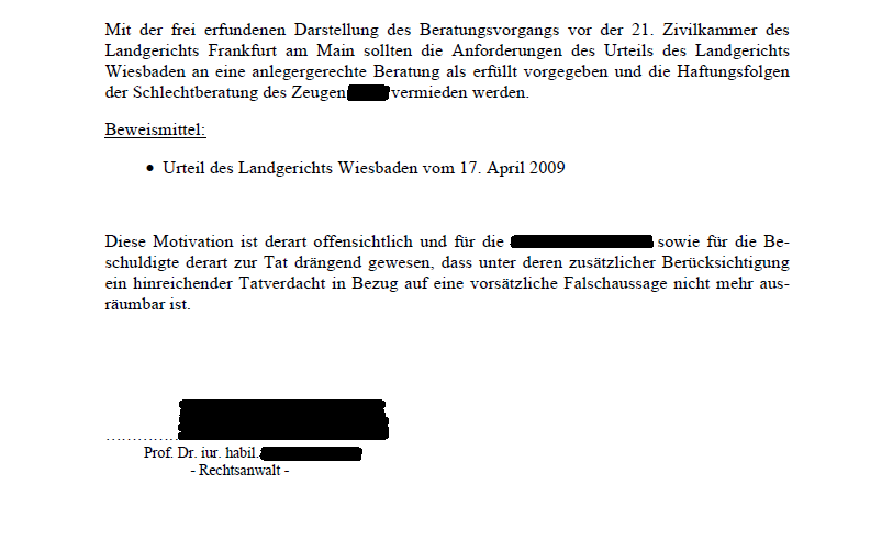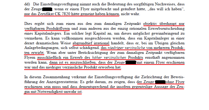 Hinzu kommt, dass die in der Ermittlungseinstellung gegen die übereinstimmenden Aussagen der Zeugen beider Parteien konstruierte Möglichkeit einer dennoch vorliegenden Beratung auf einer glatten Falschzitierung der Aussage des "Zeugen" der Bank beruht: Dieser "Zeuge" konnte sich ausdrücklich gerade nicht an irgendeine Beratung eines Kunden, insbesondere an eine Beratung für mich, hinsichtlich eines Zertifikats erinnern. Die Zeugenaussage vom 15.07.2010 schließt mit der Angabe, mich nicht zu kennen, so eindeutig die Möglichkeit einer Beratung aus, dass hier von einer vorsätzlichen Falschaussage in der Ermittlungseinstellung auszugehen ist. Diese Tatsachenverdrehung durch die "ermittelnde" Staatsanwältin der Staatsanwaltschaft Frankfurt am Main ist so offensichtlich, dass sie als Musterbeispiel staatsanwaltlicher Vertuschungen angeführt wird.