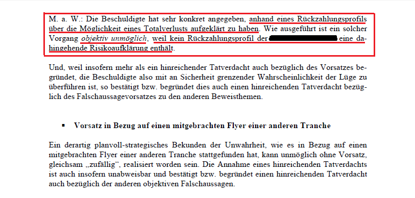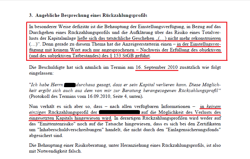 Dies bezieht sich auf Punkt 3, Angebliche Besprechung eines Rückzahlungsprofils. In dieser vorsätzlichen Falschaussage der Zeugin der Bank wird nicht auf ein drei Jahre zurückliegendes Geschehen oder Ereignis Bezug genommen, sondern auf die in derselben Vernehmung am 16.09.2010 erfolgte Vorlage eines Rückzahlungsprofils als angeblichem Beweismittel für die Dokumentation des Verlustrisikos des eingesetzten Kapitals. Damit scheidet "schlichtes Irren" hinsichtlich drei Jahre alter Vorgänge, wie der Zeugin in der Ermittlungseinstellung vom 08.07.2011 konzediert, mit Sicherheit aus, und der Vorsatz der Falschaussage ist evident. Der nachfolgende Satz bezieht sich auf den Vorsatz der Falschaussage hinsichtlich der angeblichen Beratung durch den falschen Zeugen der Bank.