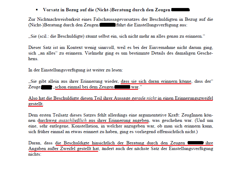 - Der überzeugend geführte und unbezweifelbare Beweis des Ausschlusses eines Erinnerungszweifels wird durch die tatsächliche Aussage der Beschuldigten vom 16.09.2010 sogar noch weiter erhärtet, die zudem die Formulierung in der Ermittlungseinstellung widerlegt: