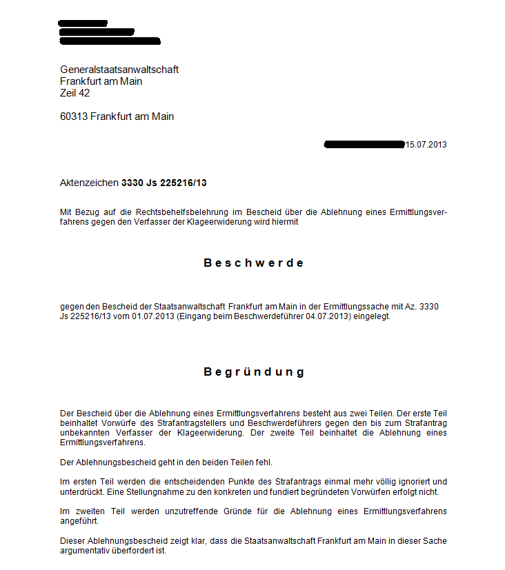Lesen Sie nun bitte die Beschwerdeabweisung vom 19.09.2013 durch die Generalstaatsanwaltschaft.