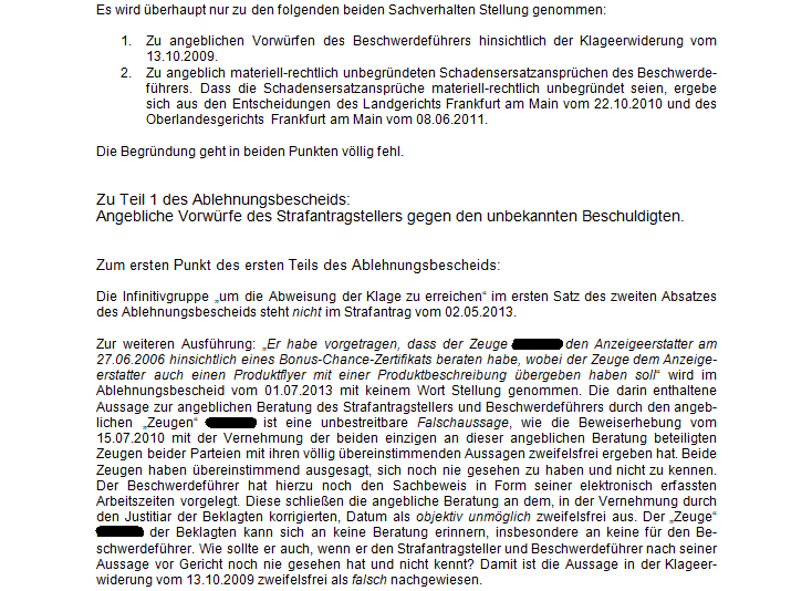 Beschwerde vom 15.07.2013 gegen Ermittlungsablehnung Verfasser Klageerwiderung