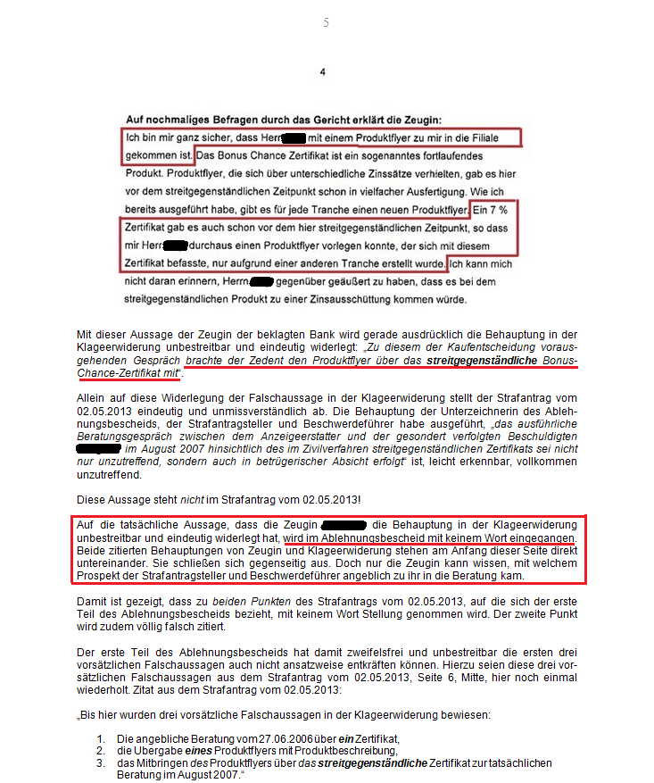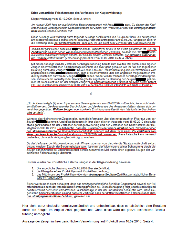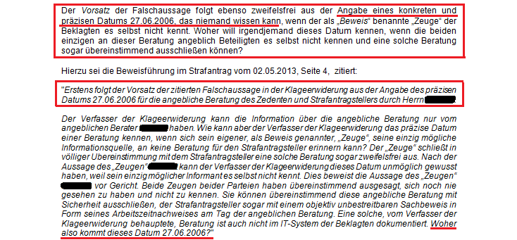 - Beweis des Vorsatzes für die Falschaussage zur angeblichen Beratung durch einen frei erfundenen "Zeugen" der Bank am 27.06.2006