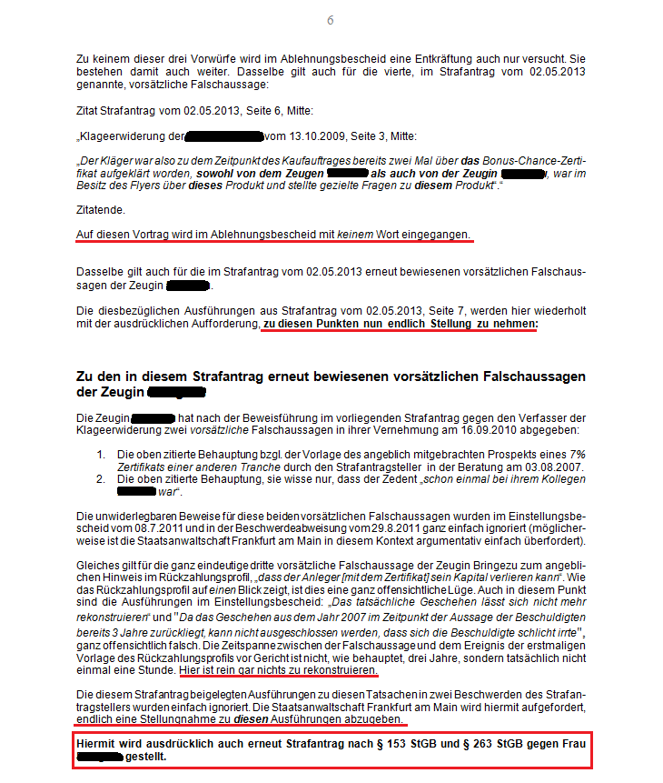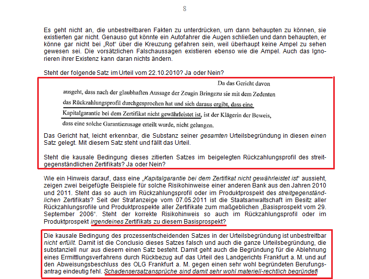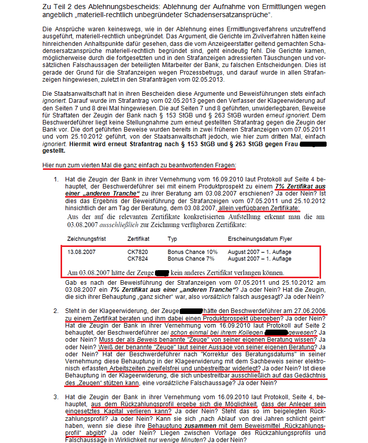 Auf dieser Seite 7 meiner Beschwerde gegen die Ablehnung eines Ermittlungsverfahrens gegen den Verfasser der Klageerwiderung wird in Frageform der Nachweis der dreisten Lügen der Zeugin B der Bank und der ebenso dreisten Vertuschungsversuche durch eine Frankfurter Staatsanwältin geführt. In der unten verlinkten Beschwerdeabweisung findet sich keine Antwort auf die hier gestellten Fragen. Stattdessen wird dort die nie enden wollende verlogene Litanei "materiellrechtlich unbegründeter Schadensersatzansprüche" ein weiteres Mal heruntergebetet und mit den Rechtsbeugungen von Landgericht und Oberlandesgericht "begründet". Wahrheit, Gesetz und Recht sind chancenlos im Frankfurter Justizsumpf.