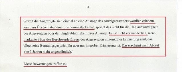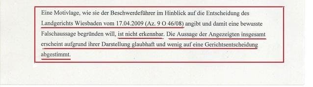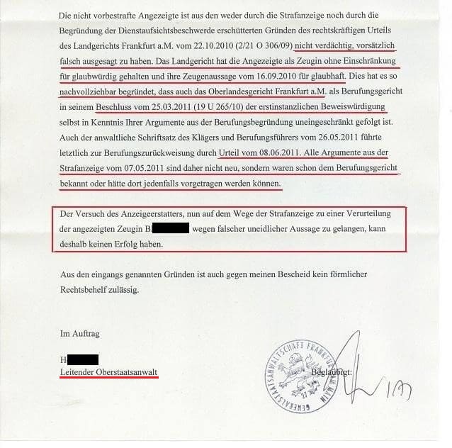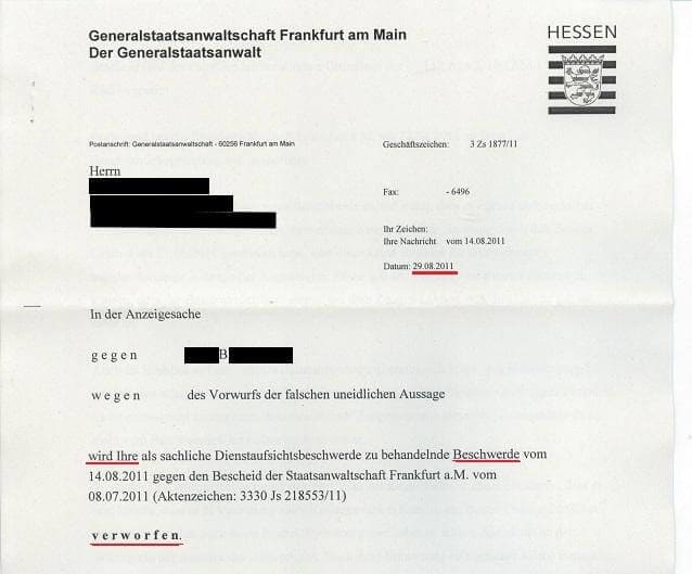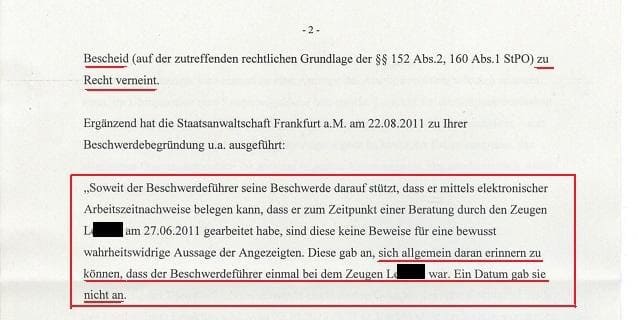 die Aussage der Angezeigten glaubhaft ist, muss ich gelogen haben. Die Rollen von Tätern und Opfern werden von den Justizbehörden Frankfurt am Main, wie stets in diesem Skandal, einmal mehr einfach vertauscht.