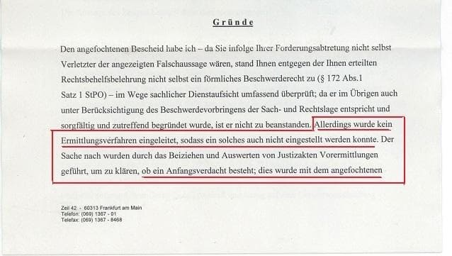 Wie passt diese Behauptung zu den Sachstandsinformationen in dieser Sache? Dort wird mit Schriftsatz vom 29.06.2011 behauptet, die Ermittlungen dauerten noch an. Hier wird behauptet, Ermittlungen seien gar nicht eingeleitet worden. Die Erklärung für diesen merkwürdigen Widerspruch finden Sie in der Sachstandschronologie unter dem Eintrag "02.08.2011: Telefonische Auskunft ... ": Ausgerechnet der Vorgesetzte der "ermittelnden" Staatsanwältin hat am 02.08.2011, nach dem Einstellungsbescheid vom 08.07.2011 und vor dieser Beschwerdeabweisung vom 29.08.2011, in einem Telefonat nichtsahnend die bloße Scheinermittlung in dieser Sache verraten mit der Auskunft, unter den mit "3330" beginnenden Aktenzeichen würden ausschließlich Einstellungsbescheide der Abteilung "33" der Staatsanwaltschaft Frankfurt am Main geführt.