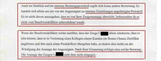 Dies ist der vierte und letzte Schritt im Zusammenspiel von Bank und Justiz um die vorsätzlichen Falschaussage zu der "Klagedrohung gegen die Beraterin", nachdem diese mich angeblich über das Verlustrisiko des von mir angeblich ausdrücklich verlangten Zertifikats aufgeklärt hat.
