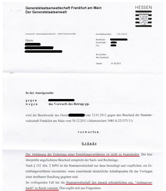Beschwerdeabweisung vom 01.02.2012 durch die Generalstaatsanwaltschaft