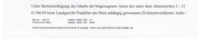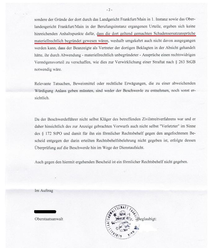 Zum "Argument" meiner "materiellrechtlich unbegründeten Schadensersatzansprüche" wird auf die Beschwerde gegen die Ablehnung einer Ermittlung gegen den Verfasser der Klageerwiderung verwiesen. Was dort steht, gilt für alle Bescheide, in denen unzulässig auf das vorsätzliche Fehlurteil des Landgerichts Frankfurt am Main vom 22.10.2010 rekurriert wird. Weiter wird auf die Seiten 20 und 21 des Strafantrags vom 08.08.2014 wegen Strafvereitelung im Amt verwiesen.