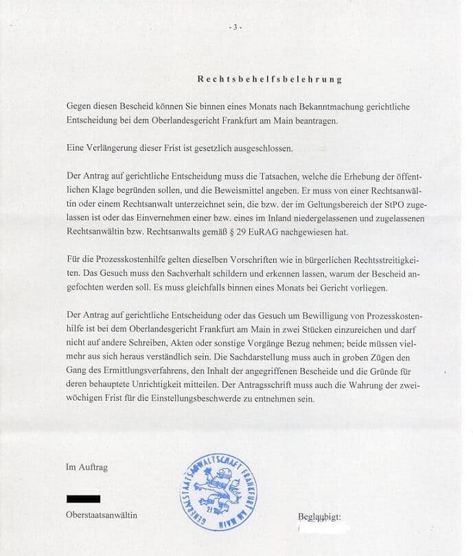 Gegen diesen Bescheid ist binnen 2 Wochen nach der Bekanntmachung die Beschwerde an den Generalstaatsanwalt in Frankfurt am Main / Leitenden Oberstaatsanwalt bei der Staatsanwaltschaft Frankfurt am Main zulässig.