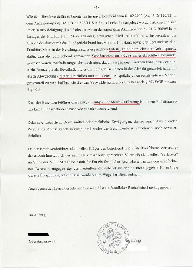 Und in einem weiteren Strafantrag vom 12.02.2016 wegen erneuter Strafvereitelung im Amt wird aufgezeigt, wie die Staatsanwaltschaft Frankfurt am Main selbst ihr stereotypes Argument "materiellrechtlich unbegründeter Schadensersatzansprüche" als eindeutig unzulässig widerlegt.