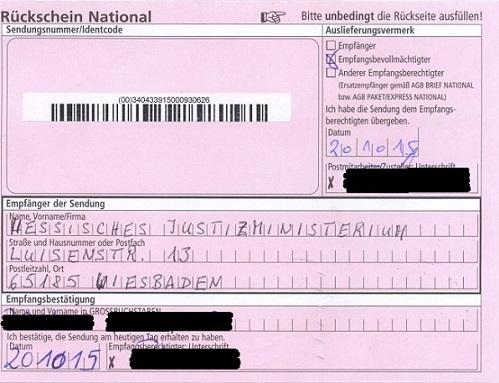 Postalischer Beleg des Eingangs meines Strafantrags beim HMdJ am 20.10.2015