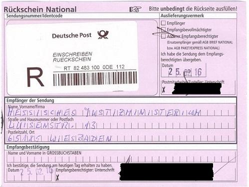 Postalischer Beleg des Eingangs meiner Strafanträge beim HMdJ am 25.02.2016