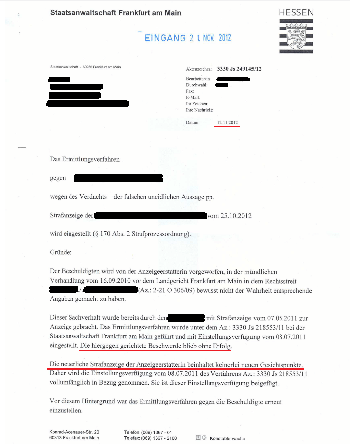 Die Staatsanwältin begründet die Einstellung dieses "Ermittlungsverfahrens" mit den Vertuschungen, Falschzitierungen und Sachverhaltsverfälschungen aus ihrer Einstellung des "Ermittlungsverfahrens" vom 08.07.2011 im Falle einer anderen Strafanzeige vom 07.05.2011 gegen die Beraterin und Zeugin der Bank.