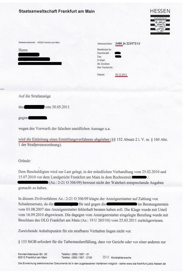 Dem Justiziar wird einzig und allein vorgeworfen, in den Terminen am 25.02.2010 und 15.07.2010 die vorsätzliche Falschaussage bzgl. einer Beratung seitens des "Zeugen" L der Bank abgegeben zu haben, weiter nichts. Für diese Beschuldigung werden in der Strafanzeige Zeugen benannt. Diese werden von der Staatsanwaltschaft nicht befragt. Das Beweisangebot wird ignoriert.