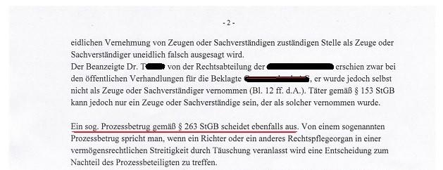 Ein Prozessbetrug nach § 263 StGB scheidet nach diesem Bescheid aus, weil die Richterin keine, durch Täuschung veranlasste, Entscheidung zum Nachteil einer Prozesspartei
